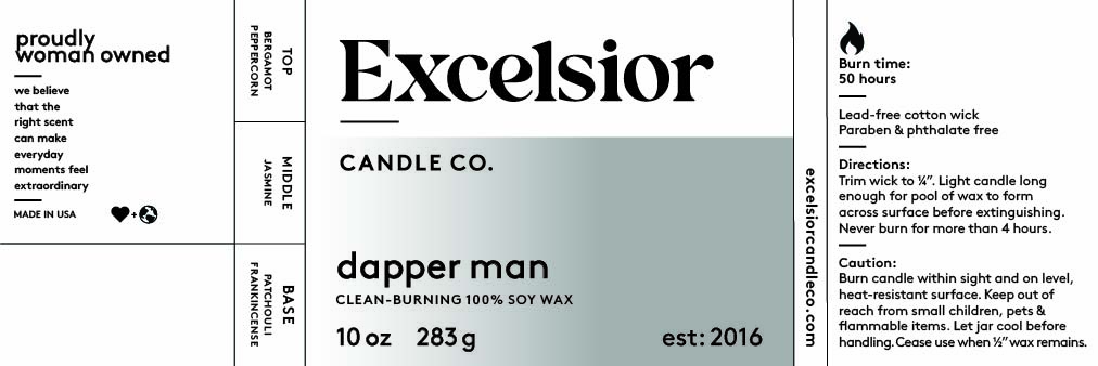 Hello, handsome. The Dapper Man Soy Candle is everything to expect from a masculine scent. You will be greeted by bold notes of bergamot, peppercorn, ginger, and jasmine. Plus, base notes of patchouli and frankincense round out a musky but slightly sweet fragrance that is complex, yet sophisticated. Bring him home today.