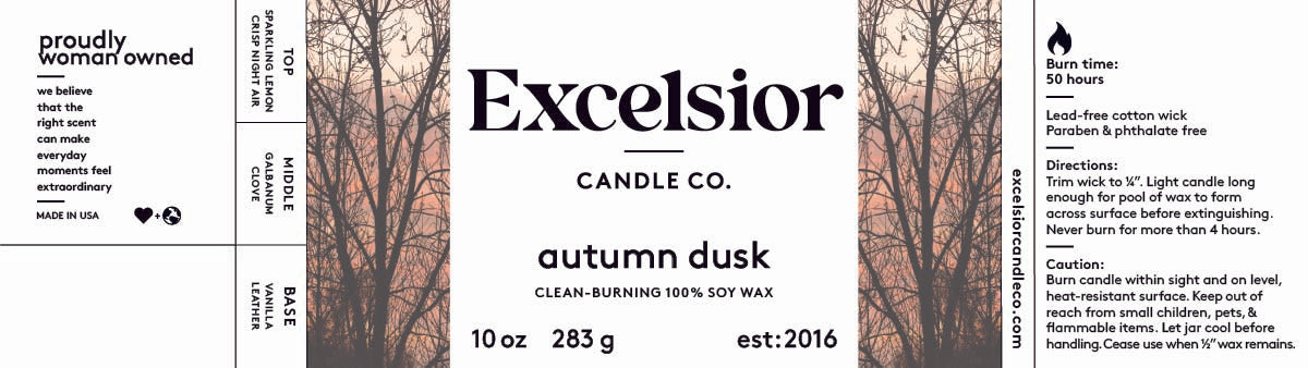 The sun fades below the canopy of the trees and the Autumn Dusk Soy Candle comes to life. Hear the crunch of the leaves as you take an evening stroll, breathing in the night air. It’s a crisp, woodsy scent with notes of clove and galbanum warmed with amber and leather.